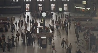 Peter Weir has used a high angle shot over 30th Street Station in Philadelphia. This shot has been utilised to signify that the cluster of people are small and unimportant. Muted colours and low light have been chosen for this scene to create a sense of a corrupt and tainted station.